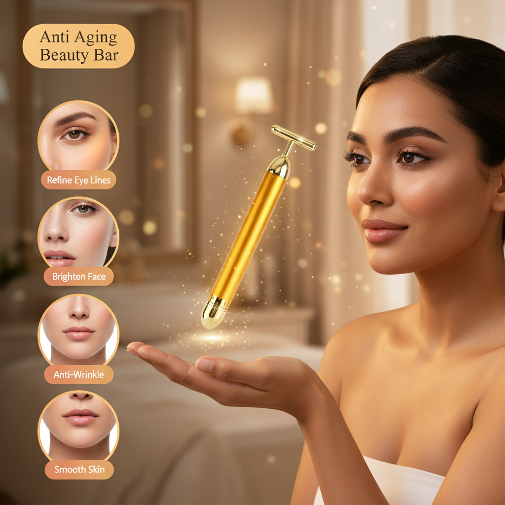 The 24K Gold Beauty Bar releases gold negative ions through gentle vibration massage, helping to stimulate skin activity, boost elasticity, and redefine facial contours. Experience firmer, smoother, more radiant skin effortlessly.