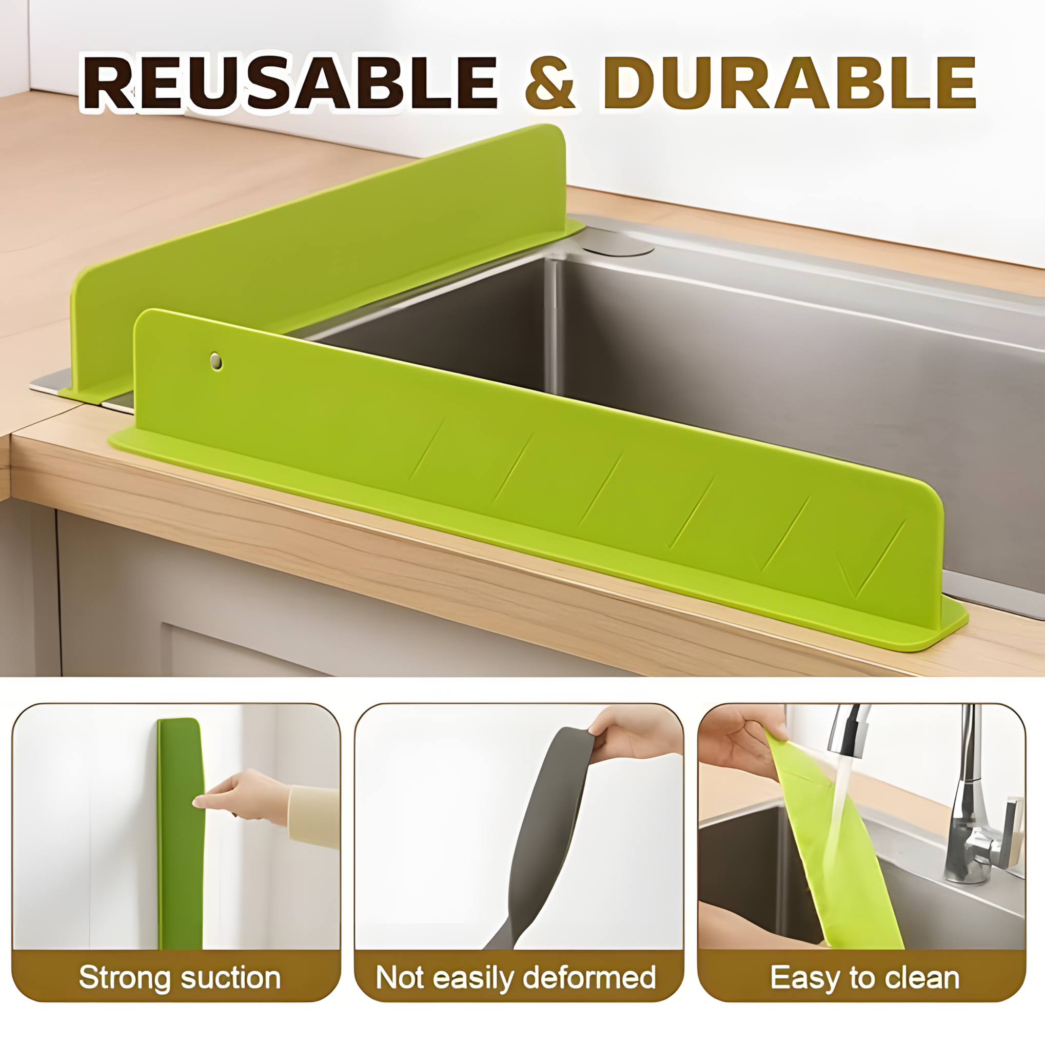 This Silicone Sink Splash Guard protects your countertop from water splashes and soap spills while maintaining a stylish, minimalist look. Its flexible silicone design fits most faucets perfectly, ensuring a dry, organized, and beautiful kitchen every day.