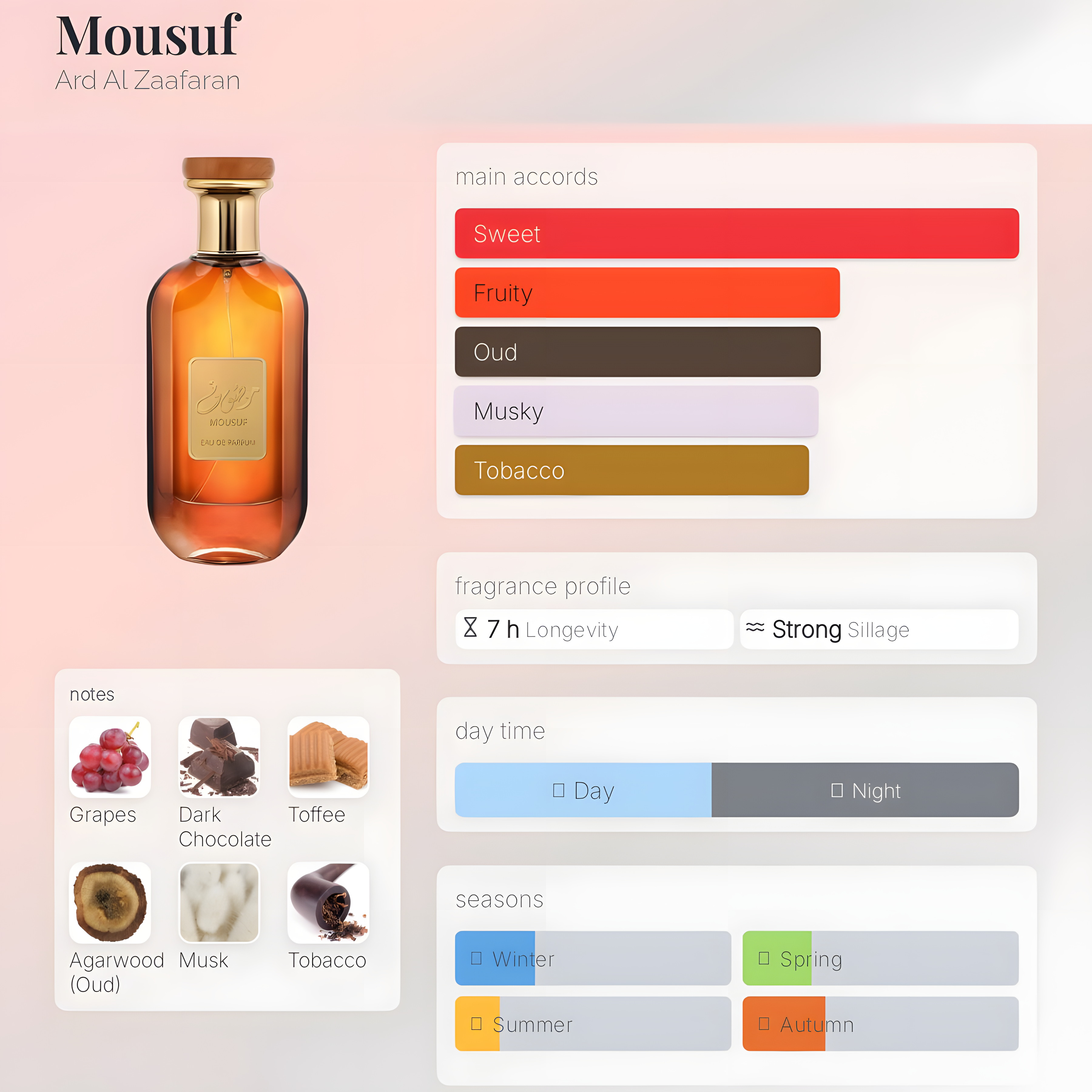 Mousuf radiates a bold projection and lingers for over 7 hours, leaving an unforgettable trail of sophistication wherever you go